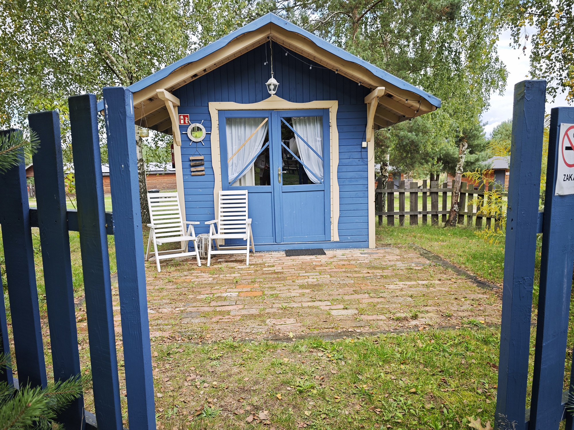 Niebieski domek to przytulne miejsce idealne na wypoczynek w agroturystyce. Z zewnątrz wita gości klasyczną drewnianą elewacją w odcieniach niebieskiego, białymi detalami oraz tarasikiem z wygodnymi krzesłami, gdzie można wypić poranną kawę i nacieszyć się ciszą otoczenia. Wnętrze utrzymane jest w ciepłym, naturalnym stylu – ściany z drewna, wygodne łóżko przykryte patchworkową narzutą, a także dodatkowe miejsce do relaksu w wiklinowym fotelu. Domek został wyposażony w łazienkę z prysznicem, co zapewnia pełen komfort pobytu. To idealna przestrzeń dla par lub osób, które szukają kameralnego i klimatycznego zakątka blisko natury.